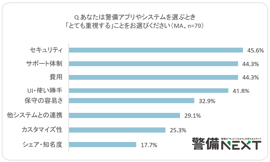 この結果から、警備会社がシステムを比較する際には、単なる機能の多さよりも、「安全に運用できるか」「困ったときに相談できるか」「コストが見合っているか」「現場が無理なく使えるか」といった、運用フェーズでの安心感や使いやすさが重視されていることがわかります。
