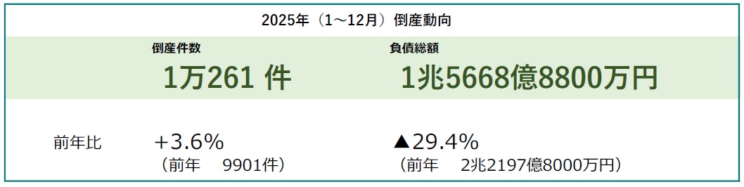 2025年の倒産件数1万261件、12年ぶりの1万件超 物価高や人手不足の影響受け小規模倒産が増加 ― 全国企業倒産集計2025年報