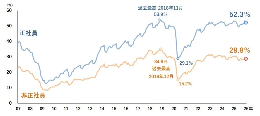 帝国データバンクの調査では、2026年1月時点で正社員不足は52.3%となり、4年連続で半数を超えています。この水準は一時的な不足ではなく、人材確保が恒常的に難しい状態に入っていることを示しています。