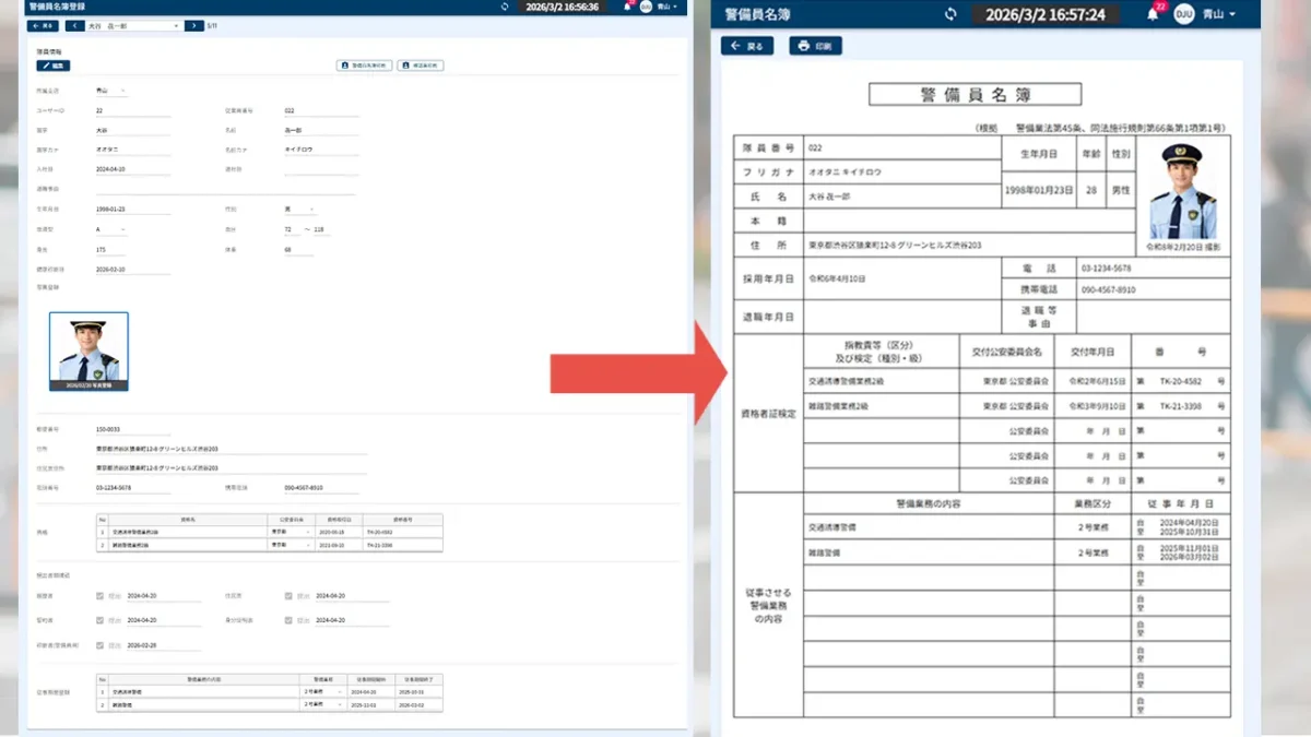 今回のアップデートでは、警備業法に基づく主要な帳簿・書類の作成に対応しています。具体的には、警備員名簿や確認票、警備契約一覧、契約前後書面(業法第13条・第19条関連)、指導・教育記録などが対象となり、日常業務で入力されたデータをもとに自動で生成されます。