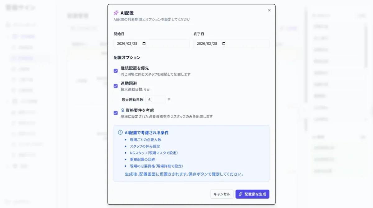 これらの条件をもとに配置案が作成され、管理者は確認と調整を行う運用となります。